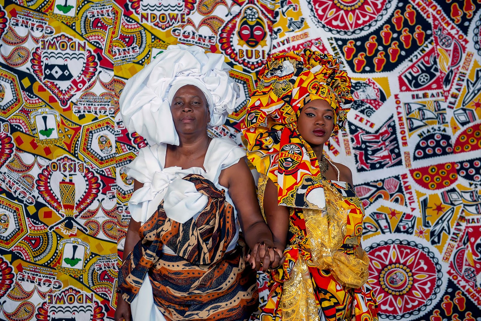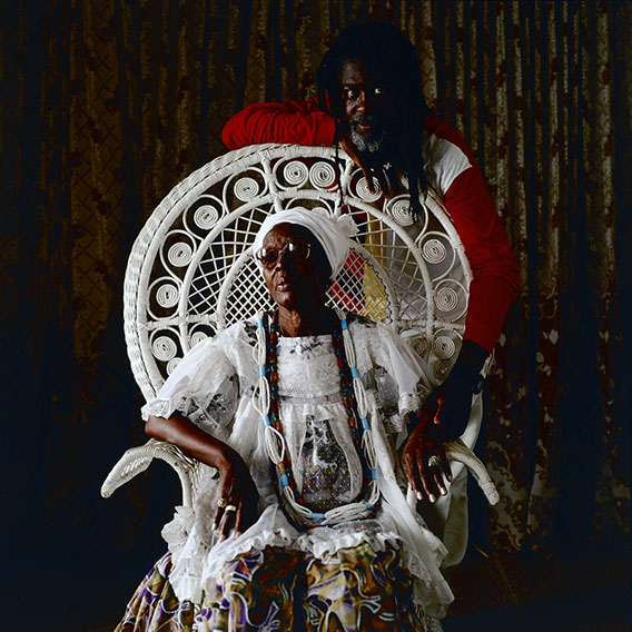Fotos em tecido apresentam detalhes do terreiro Ilê Axé Jitolu e de Hilda Dias dos Santos (Salvador, 1923-2009), a Mãe Hilda Jitolu, ialorixá (sacerdotisa líder em iorubá). Ela fundou o bloco ao lado do filho Antonio Carlos dos Santos Vovô. Nascido em 1952, igualmente na capital baiana, hoje ele é presidente do Ilê Aiyê, uma lenda do Carnaval da Bahia e importante personalidade do movimento negro brasileiro.